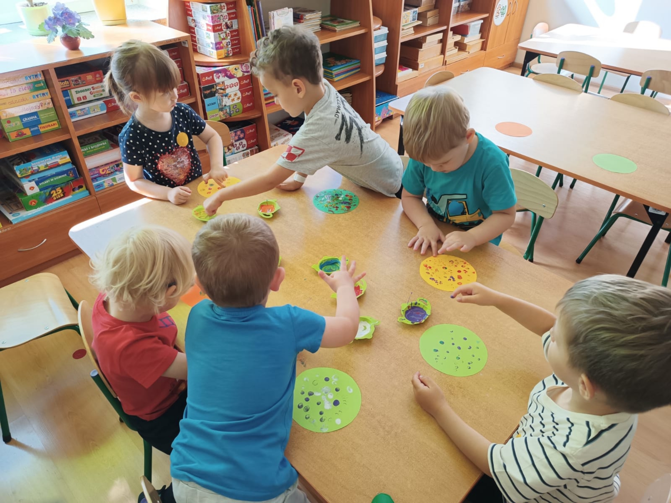 15 września w naszej grupie obchodziliśmy Międzynarodowy Dzień Kropki. Bohaterką dnia była KROPKA. Przedszkolaki na początek poznały dziewczynkę Vashti, która dzięki malutkiej kropce i zachętom nauczycielki odkrywa swój talent artystyczny i wiarę we własne możliwości. Następnie bawiliśmy się z kropkami przy muzyce, układaliśmy kropki wg wielkości i koloru, odszukiwaliśmy pasujące połówki, malowaliśmy kropkami kolorowe piłki. Było twórczo i radośnie.