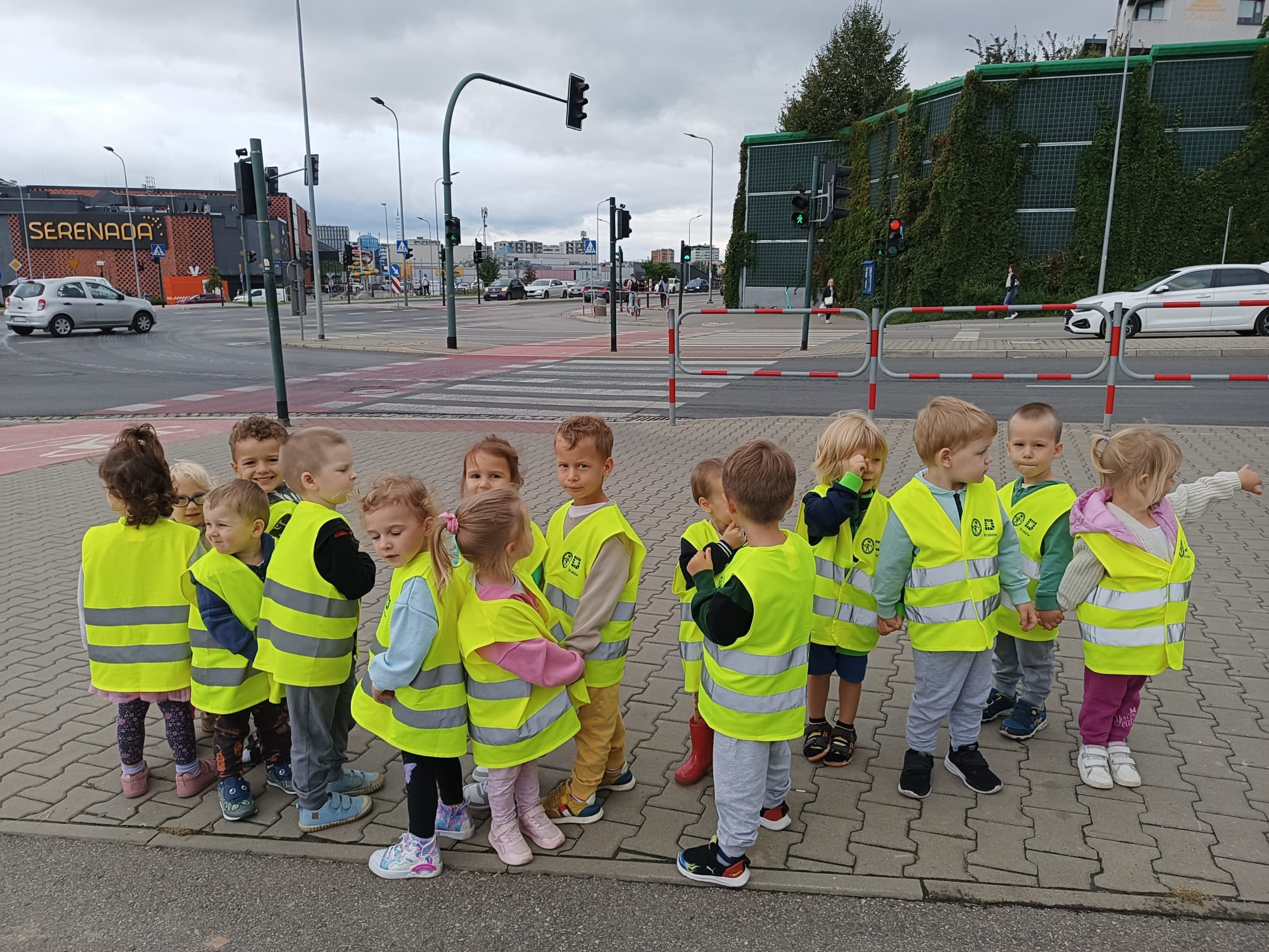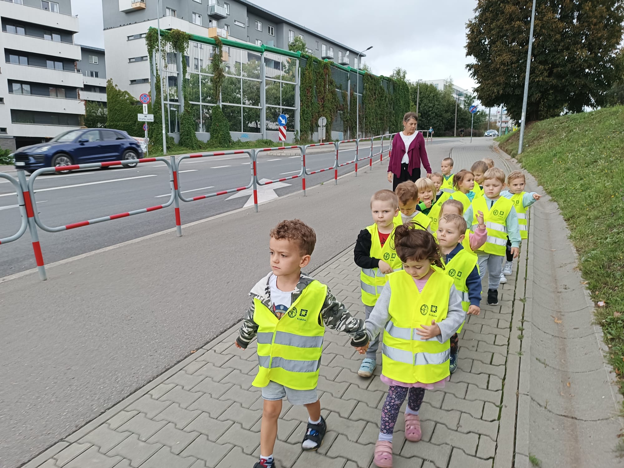 11 września, ubrani w kamizelki odblaskowe, wyruszyliśmy na najbliższe skrzyżowanie ulic. Wycieczka miała na celu poznanie zasad prawidłowego poruszania się po chodniku parami i zasad bezpiecznego przechodzenia przez ulicę. Przedszkolaki obserwowali ruch drogowy, wskazywali przejścia dla pieszych, przyglądali się zmieniającym światłom w sygnalizatorze i bez problemu wyjaśniali co one oznaczają. W czasie spaceru wzdłuż ulicy dzieci zwracały uwagę na mijane znaki drogowe.